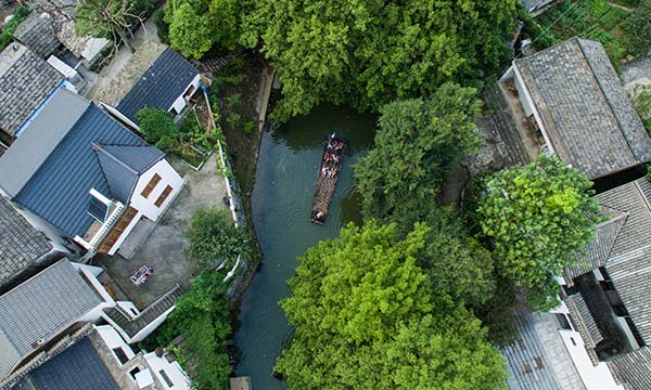 8月12日,游客乘坐竹排游览上泗安村的乡村美景。