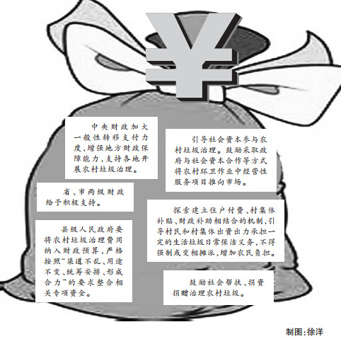 《意见》明确了县级人民政府是农村垃圾治理的责任主体,其任务包括建立保洁制度,收运和转运设施建设及长效运行机制的建立。县级财政要把农村垃圾治理的工作承担起来。如何支持,由各地负责制订具体措施和规定。另外,要建立长效的管理机制,这包括农村垃圾保洁制度的补助、农村垃圾转运设施建设和管理的规章以及垃圾处理设施的建设和维护制度。中央财政也会加大一般性转移支付的力度支持地方开展农村垃圾治理。