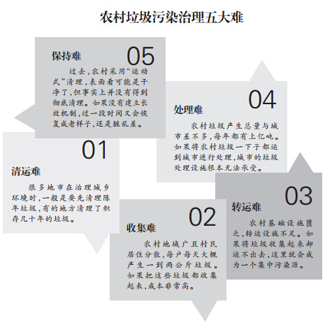 农村垃圾治理存在“五大难”,即陈年垃圾清运难、农村垃圾收集难、农村垃圾转运难、农村垃圾处理难、长效保持难。
