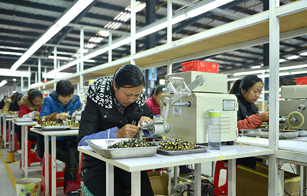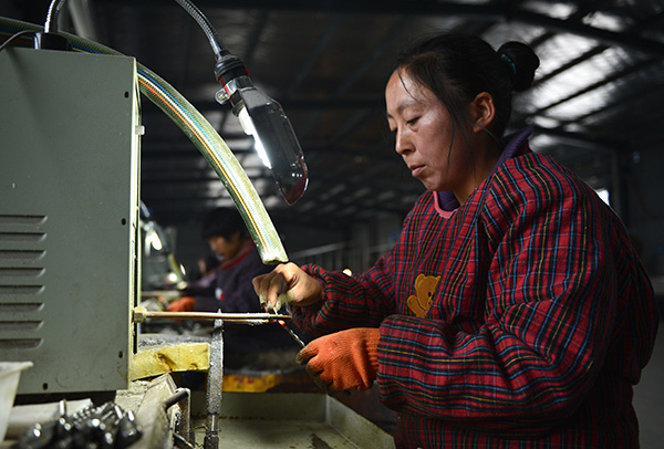 一名农妇在湖北省宣恩县和平工业园钻头生产线上作业(12月10日摄)。