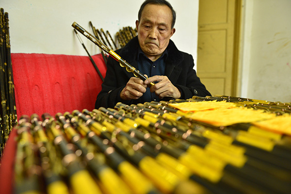 在湖北省宣恩县一文化企业扶持下,李家河镇农民侯安星在制作演出道具“霸王鞭”,年收入近4万元(12月11日摄)。