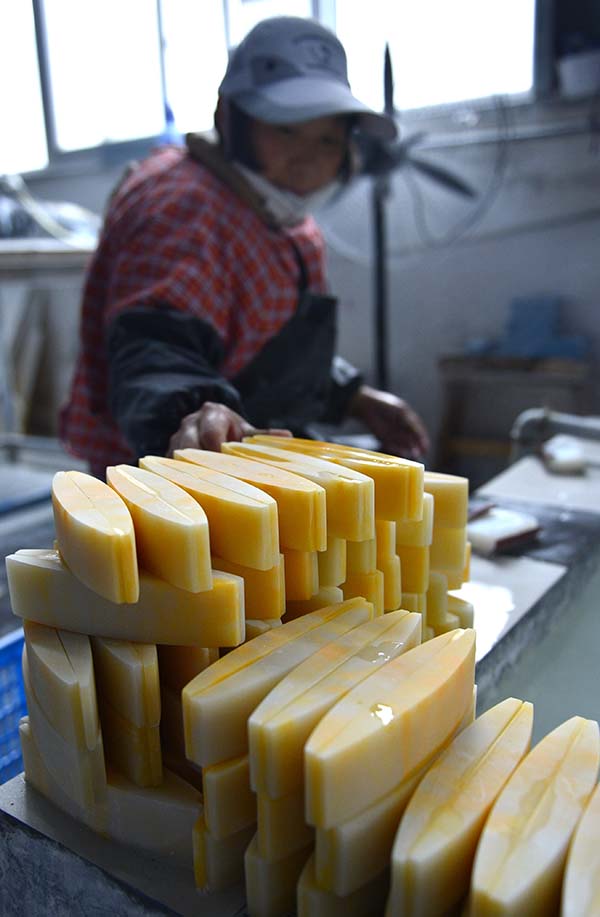 一名农妇在湖北省宣恩县和平工业园打磨人工玉石(12月10日摄)。