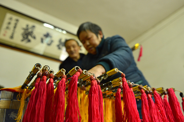 在湖北省宣恩县一文化企业扶持下,李家河镇农民侯安星、黄金云夫妇在制作演出道具“霸王鞭”,年收入近4万元(12月11日摄)。