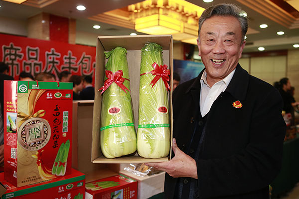 12月18日,河北省玉田县的张金齐老人展示其合作社生产的“玉田白菜”。