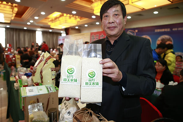12月18日,河北唐山晶红田美农场工作人员刘银才展示他们农场出产的富硒大米。