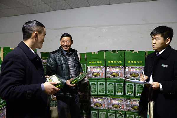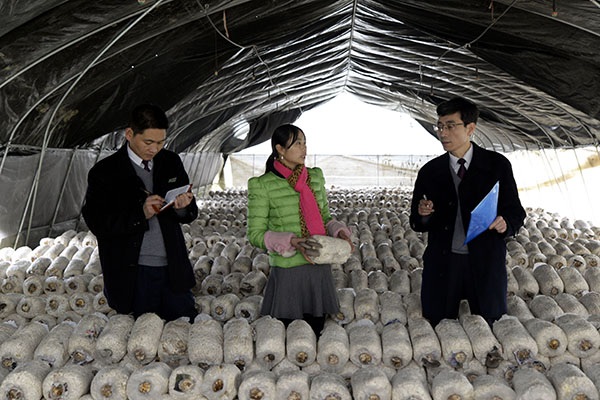 1月1日,在贵州省遵义市凤冈县龙泉镇文峰村,龙泉信用社工作人员在村民任娅(中)的食用菌种植场调查情况。任娅通过信用社获得贷款22万元,兴办了一个食用菌种植场,年产值可达50万元。