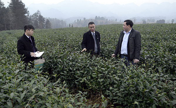 1月1日,在贵州省遵义市凤冈县土溪镇大连村,土溪镇信用社工作人员在村民罗明刚(右一)的生态茶园调查了解情况。罗明刚通过信用社获得贷款50万元,创办了娄山春茶叶专业合作社,种茶1000余亩。