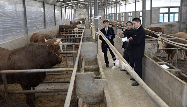 1月1日,在贵州省遵义市凤冈县龙泉镇六里村,龙泉信用社工作人员在村民付启勇(中)的养牛场调查情况。付启勇通过信用社贷款80万元,兴办了一个养牛场,目前牛存栏100余头。