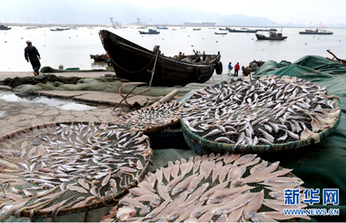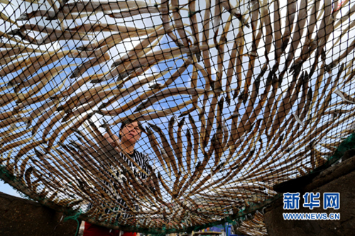 10月18日,江苏连云港一渔村的渔民在晾晒鱼干。 近期,江苏省连云港市沿海地区渔村鱼干飘香。渔民将捕获的带鱼、黄鱼等海产品腌制、晾晒,加工成鱼干供应各地市场
