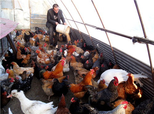 图为养鸡户李仓在给鸡喂食。刘江 摄
