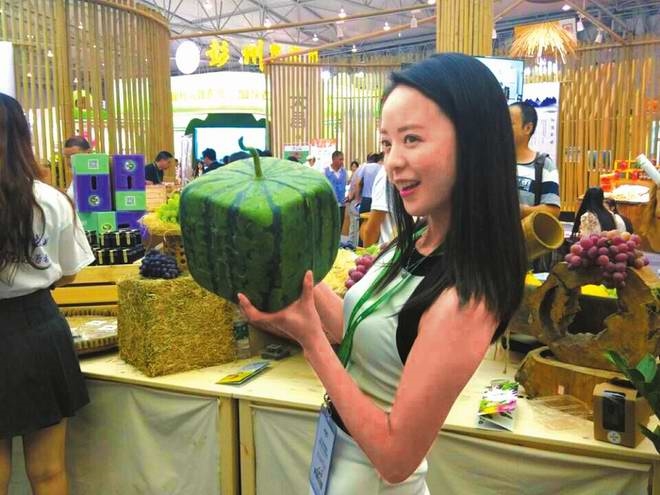 此外,网上呼声超高的“方脑壳”西瓜,也让众多网友一饱眼福。“从没听说西瓜也方了。”对于网友疑问,展区工作人员介绍,这是采用特制磨具,在西瓜成长阶段进行塑形的,“因为糖分被压缩,所以这种西瓜更甜,价格也比一般西瓜贵。”