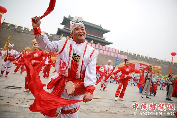 3月18日,人们在石家庄市正定县南城门前表演陕西安塞腰鼓。