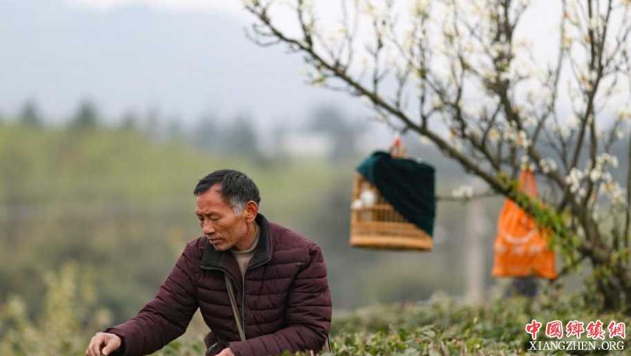贵州省丹寨县兴仁镇石槲茶园内,一名茶农一边逗着他的画眉鸟一边采摘春茶。