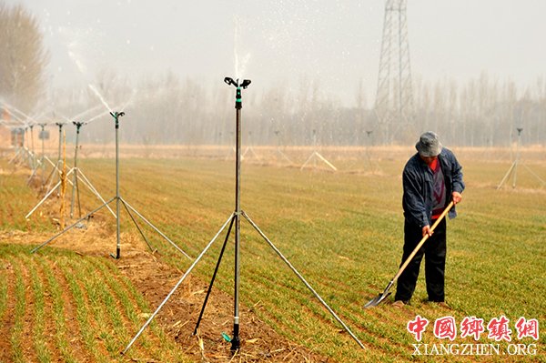 3月22日,泊头市宋八屯村村民正在喷灌小麦。