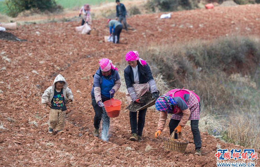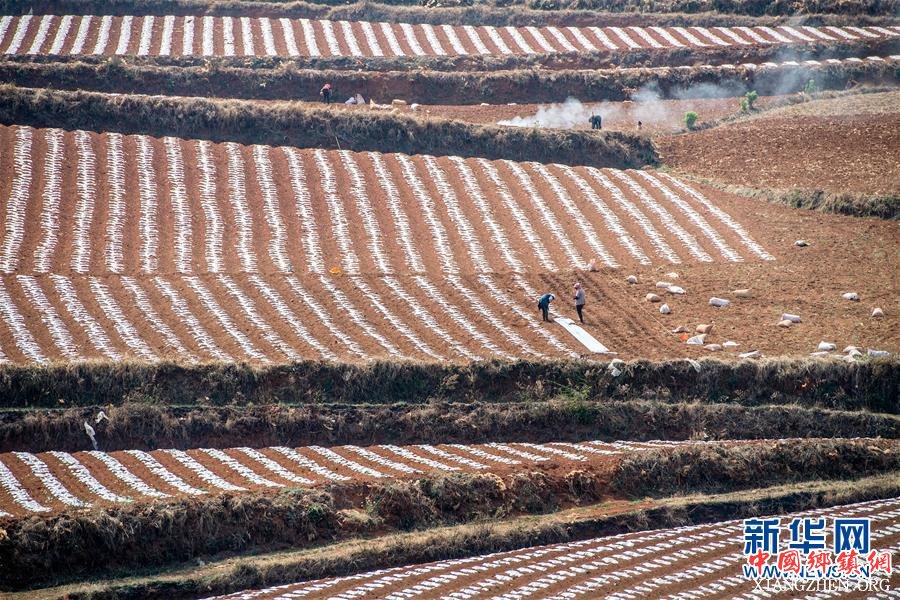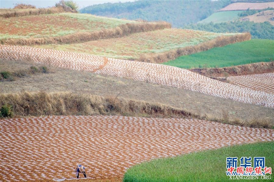 云南省昆明市东川区红土地镇农民在田间劳作(3月23日摄)。