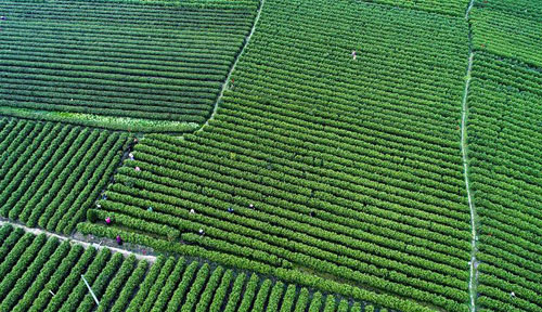 平利县城关镇金华村茶农在茶园里采摘春茶(3月25日无人机拍摄)。