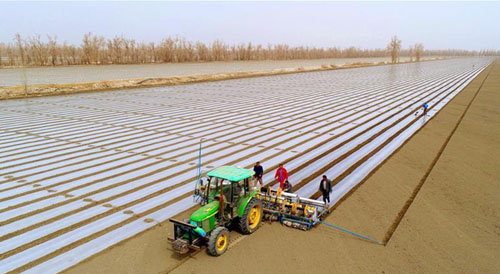 日前,位于塔里木垦区的新疆生产建设兵团职工群众开始播种棉花。据了解,塔里木垦区新疆生产建设兵团计划播种棉花300多万亩,4月上旬将完成全部播种任务。新华社发(杜炳勋 摄)