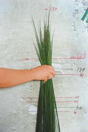 工作人员正在测量蔺草的高度,高度在125-150厘米的蔺草是最好的。
