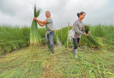木乃则日(左)挥汗如雨收割蔺草。