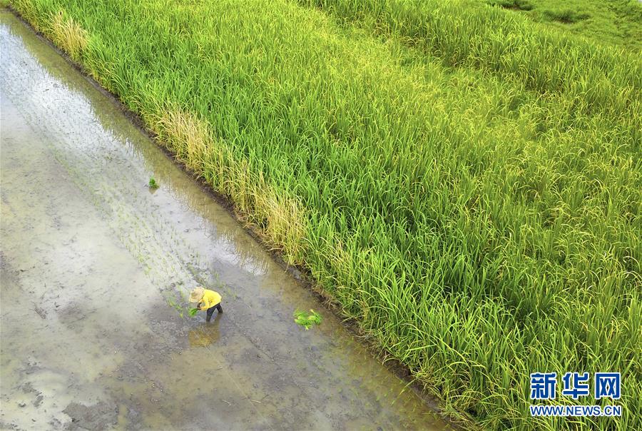 7月31日,在广西柳州市柳江区进德镇泗浪村,农民在地里插秧(无人机拍摄)。