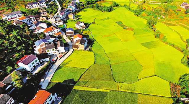 8月7日,万盛经开区青年镇湛家村,金黄色的稻谷与线条优美的梯田、美丽乡村相互映衬,美不胜收。时至立秋,水稻逐渐成熟,金黄色的稻田呈现出别样美景。