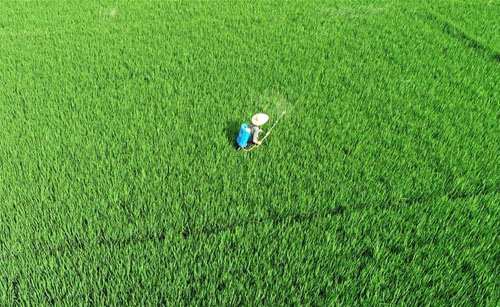 8月20日,山东省临沂市郯城县郯城街道农民在田间喷洒农药(无人机拍摄)。 新华社发(张春雷 摄)