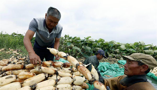 泗洪县地处洪泽湖畔,水质优良,沟河交错,水资源丰富,当地农民充分利用资源栽植浅水藕,成为增收新渠道。 新华社发(许昌亮 摄)