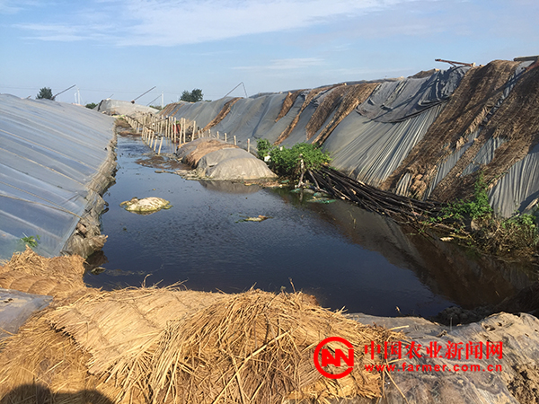 “我从23号就趟着水进来了,这些天就忙着抽水这一件事,昨天总算见着底了。”8月27日下午,纪台镇桃园村农民郑伟带着记者走进了自己的大棚。棚内严重积水不说,大棚北土墙垮塌严重,不少支撑立柱压断,更让人焦急的,是棚内源源不断还有水流渗出。