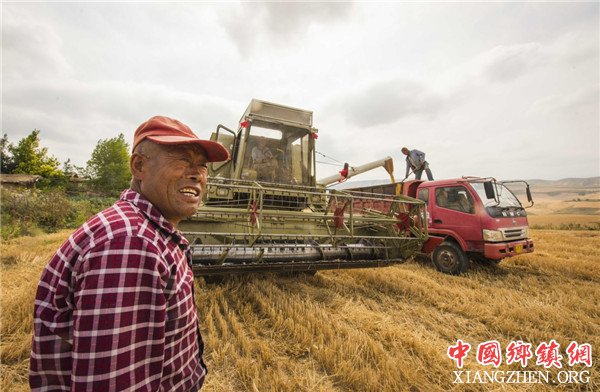 在新疆奇台县江布拉克景区,农民史生奇(左)在自家小麦地里观察联合收割机收割情况(8月27日摄)。