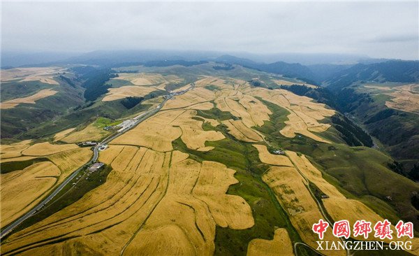 空中俯瞰新疆奇台县江布拉克景区内成熟的旱地小麦(8月27日无人机拍摄)。