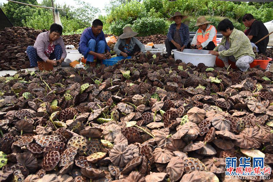 8月30日,湖州市南浔区石淙镇仁麦农业科技园农民正在手剥莲子。新华社发(施立农 摄)