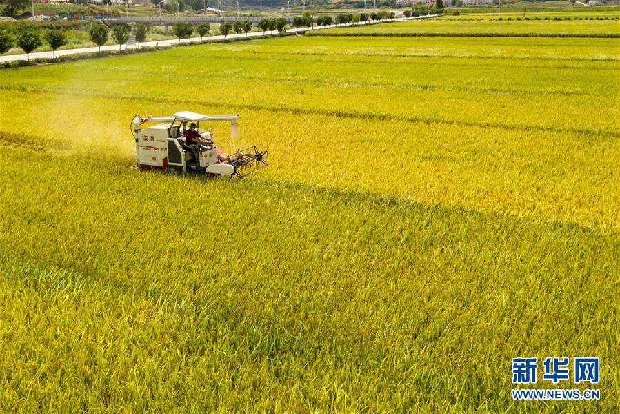 9月3日,湖北省襄阳市保康县马桥镇中坪村农民驾驶收割机在田间收割水稻(无人机航拍)。