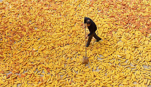 9月10日,山东省淄博市沂源县鲁村镇西坡村的农民在晾晒玉米。 金秋时节,各地农民忙着田管、收获、晾晒农作物等,田间地头、农家院落处处可见一派繁忙景象。 新华社发(赵东山 摄)