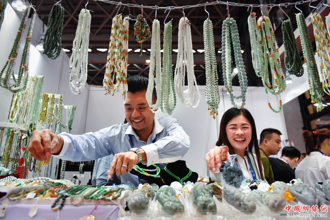 9月12日,在广西南宁国际会展中心东盟博览会展厅,两名缅甸参展商在展示饰品。