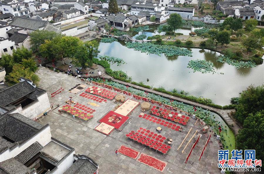 近日,安徽省黄山市呈坎古村村民利用晴好天气晾晒农作物,在古村晒场上描绘出一幅丰收晒秋图。