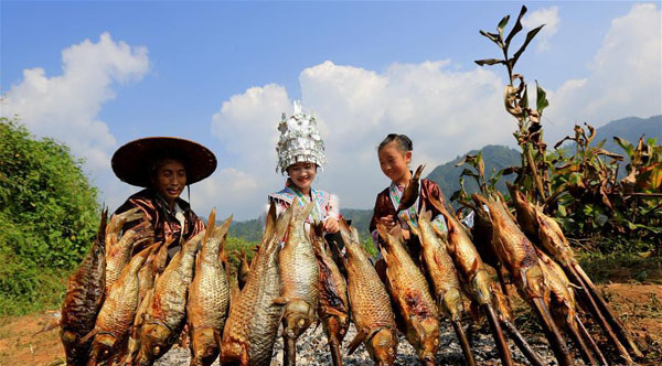 9月15日,在广西融水苗族自治县杆洞乡花孖苗寨,村民在烧鱼。 9月15日,广西柳州市融水苗族自治县杆洞乡花孖苗寨举行2018金秋烧鱼季活动,村民和游客共同开展水田拔河比赛、田间捉鱼比赛和烧鱼等活动庆丰收。 新华社发(龙涛 摄)