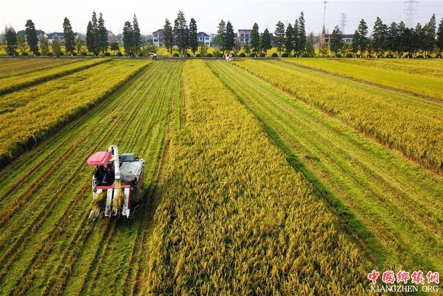 10月17日,收割机在太仓市双凤镇收获早稻(无人机拍摄)。