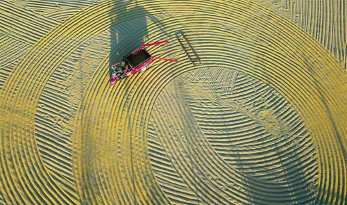 10月29日,在江苏连云港市赣榆区城西镇曲坊村,村民在晾晒稻谷(无人机拍摄)。 当下正值水稻收割、小麦播种的交错时期,各地农民抓紧农时抢收抢种。 新华社发(耿玉和 摄)