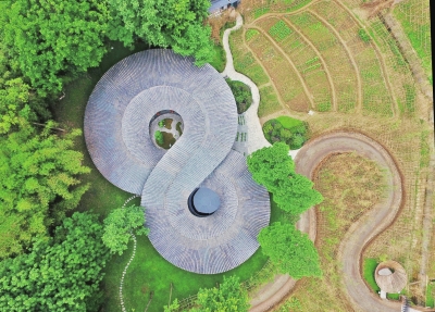 从空中俯瞰,“竹里”的外形类似“无限(∞)”这个符号。曾任蜀州(今崇州)通判的陆游,在造访道明镇的白塔禅院时,写下了“竹里房栊一径深,静愔愔。乱红飞尽绿成阴,有鸣禽”之句。设计师团队主创者、来自同济大学建筑与城市规划学院教授袁烽由此获得了设计灵感——他把当地的传统竹编工艺以一种巧妙的方式融合其中,希望这种古老技艺能借此得到传承和复兴。
