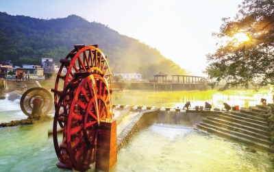 不同于三甲屯,邻村小都百屯里,却是一派恬静悠闲的风光:乔老河沿村蜿蜒而过,河水缓缓流淌,水车吱呀转动。青山绿水映衬下,白墙灰瓦的一栋栋“别墅”雅致美观,加之后山绿树竹林摇曳,颇有“小桥流水人家”的意境,可以领略“乔老河畔是吾家,君若闲时来喝茶”的惬意。