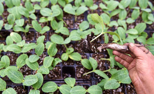 11月6日,在山东省沂南县依汶镇南栗沟村一家蔬菜育苗基地,农民在管理蔬菜幼苗。 立冬时节即将到来,山东省沂南县20多家集约化育苗基地开始进行冬季育苗,为越冬瓜菜种植做准备。沂南县在扶贫攻坚过程中因地制宜,大力发展越冬瓜菜生产,目前全县越冬大棚瓜菜面积达20万余亩,带动当地农户增收。 新华社发(杜昱葆 摄)