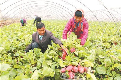 宝应县万民村生态农业基地农民在大棚内收获萝卜。 沈冬兵摄