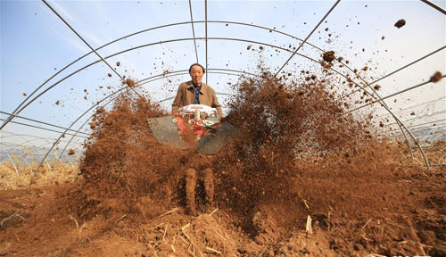 11月8日,河北省迁西县兴城镇农民在使用农机松土。 新华社记者 牟宇 摄