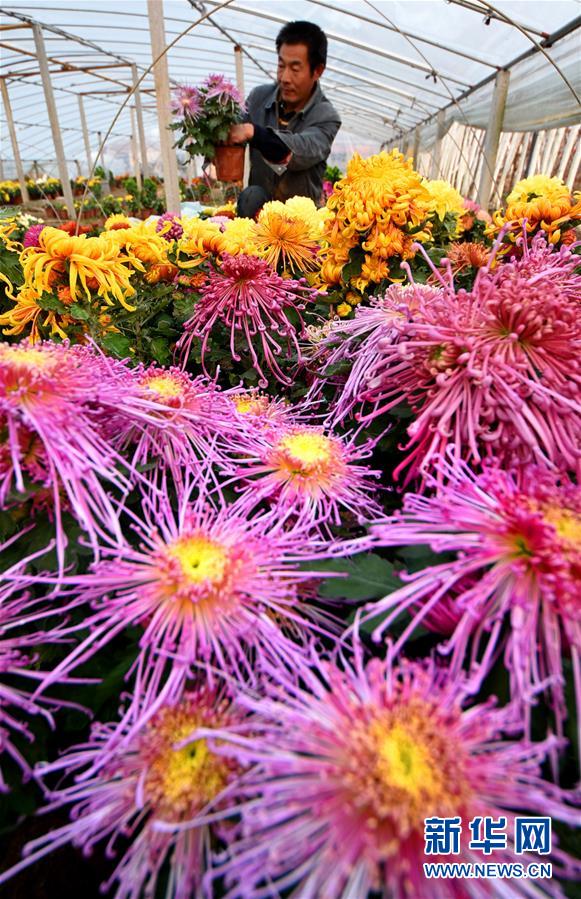 11月14日,山东省淄博市沂源县悦庄镇黄山子村的农民在大棚里管护花卉。