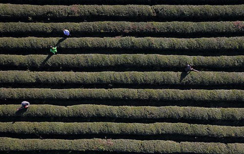 11月17日,茶农在贵州省威宁彝族回族苗族自治县炉山茶场里进行管护(无人机拍摄)。 初冬时节,农民们忙着管护、收获各类农作物,田间地头、温室大棚内一片忙碌。 新华社发(王纯亮 摄)