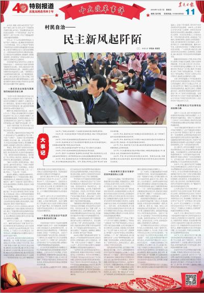 站在改革开放40周年的节点上回望,村民自治走出了一条农民自主创造与国家指导规范的互动之路,一条民主政治进步与经济制度变革的协同之路,一条培育民主意识与维护农民利益的民心之路,一条管理民主与治理有效的发展之路。这个我国最直接、最广泛、最生动的社会主义民主实践,不仅是我国农村改革大潮的重要组成部分,也将成为新时代推动乡村振兴和农村社会治理现代化的关键环节和力量源泉。