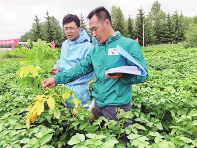 图为专家在参与示范的黑龙江万田金农业的马铃薯种薯田检查植株病害情况。