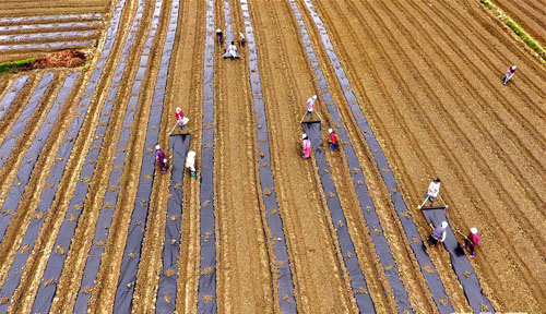 2月20日,在贵州省黔东南苗族侗族自治州榕江县忠诚镇安乐村,村民在田间覆盖地膜(无人机拍摄)。 新华社发(王炳真 摄)