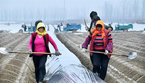 3月5日,山东省莱西市夏格庄镇西曲格庄村村民在为刚播种的胡萝卜覆膜。近日,齐鲁大地气温渐暖,大部分地区都进入春耕农忙季节,田间地头一片繁忙的景象。新华社记者 李紫恒 摄