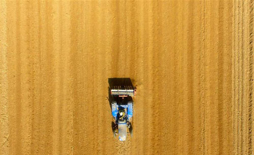 3月6日,山东省茌平县贾寨镇邢胡刘村村民驾驶拖拉机在田间劳作(无人机拍摄)。当日是二十四节气中的惊蛰,随着气温回升,各地农民忙着春耕春管,田间地头到处是一派忙碌景象。新华社发(赵玉国 摄)